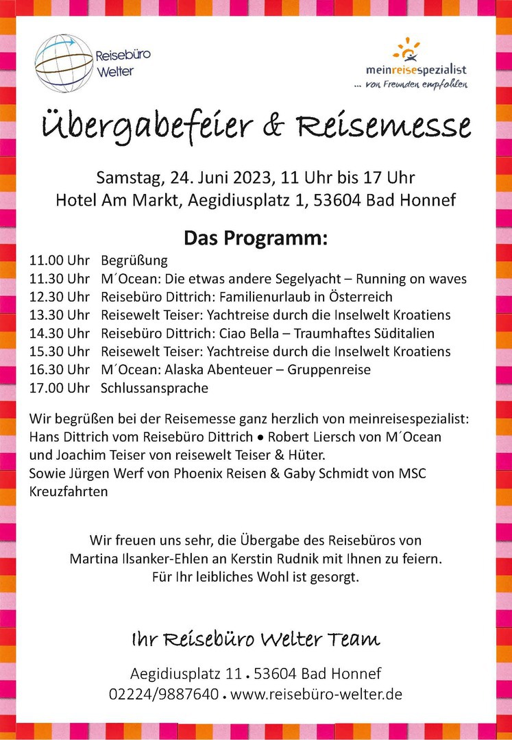 Mit der Feier haben wir eine Reisemesse verbunden. Für dieses Event sind Räumlichkeiten im Hotel Markt 1 angemietet.