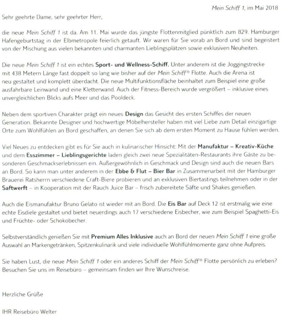 TUI MeinSchiff1 Frau Keil war für Sie an Bord.